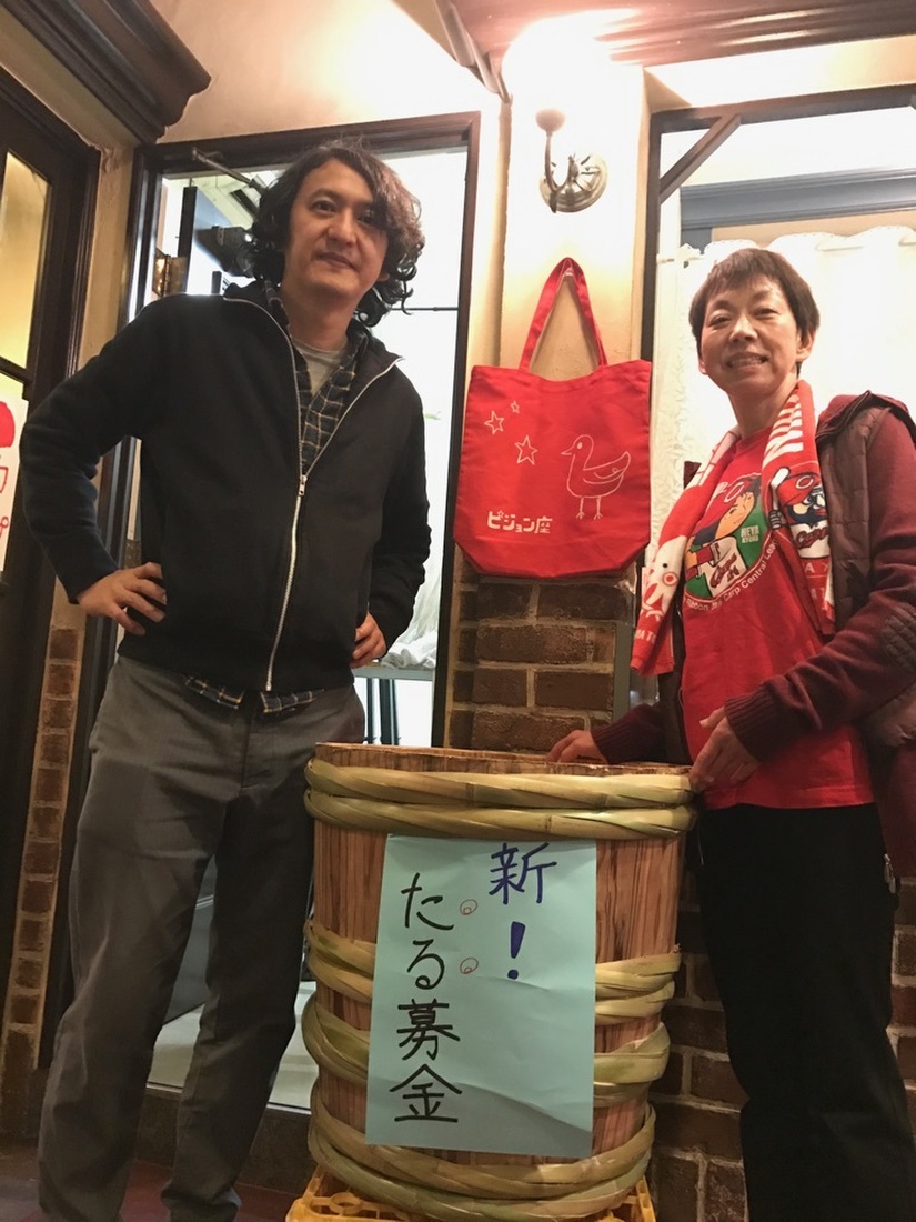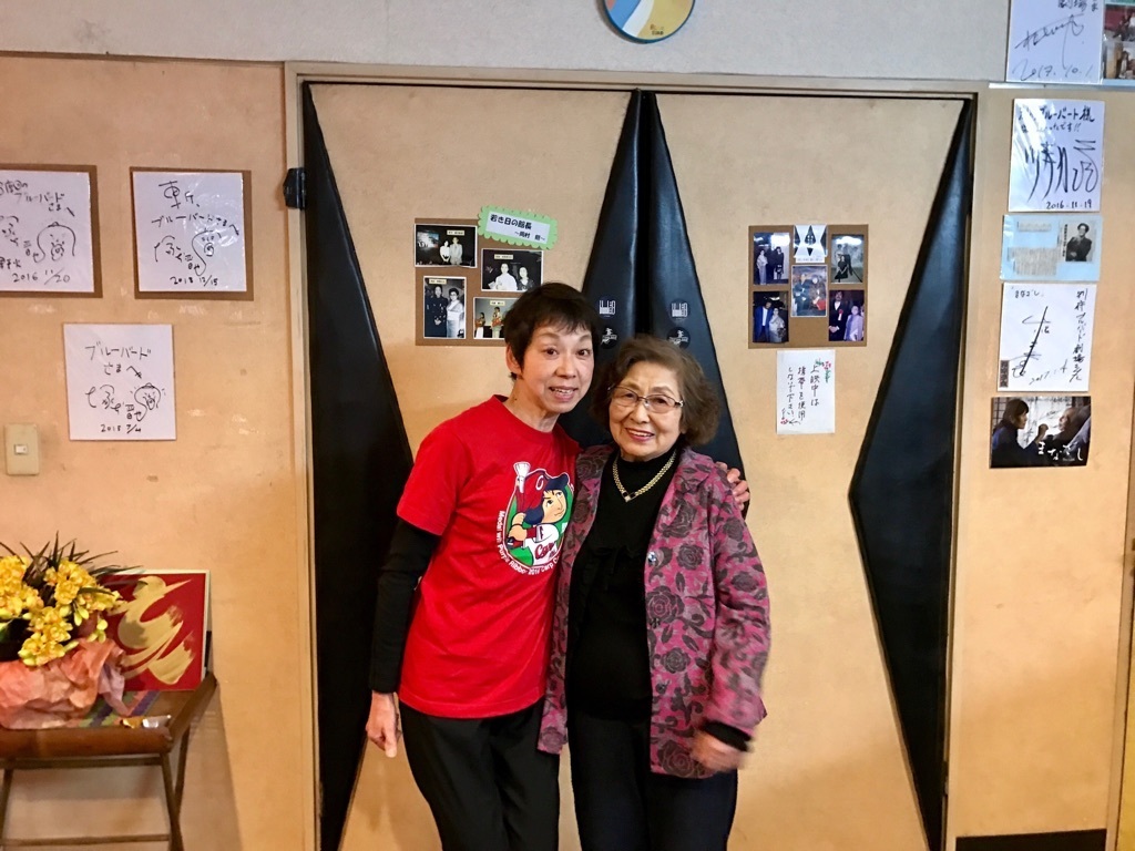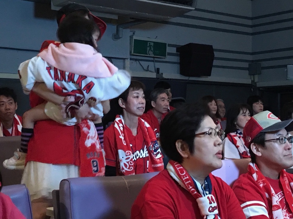 別府ブルーバード劇場のオーナー岡村照さんと部谷京子さんのカープTシャツを着て記念撮影。