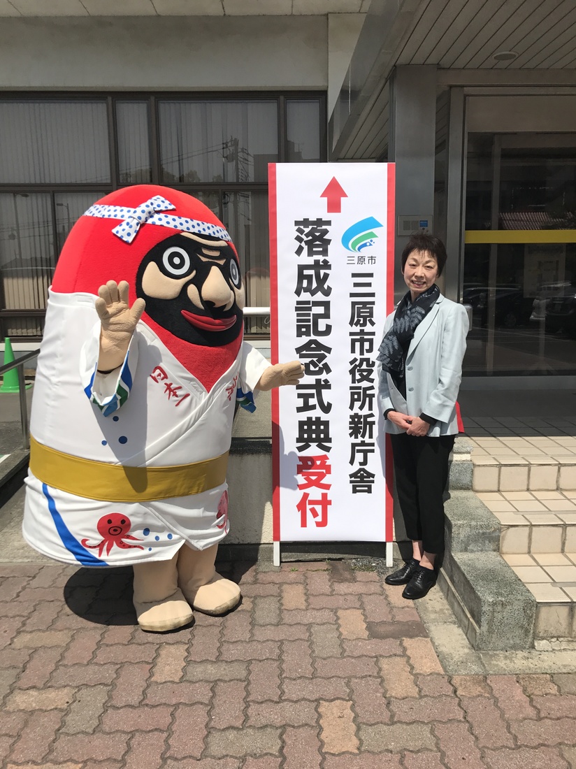 三原市のゆるキャラ、三原やっさだるマンと受付で記念撮影しました。