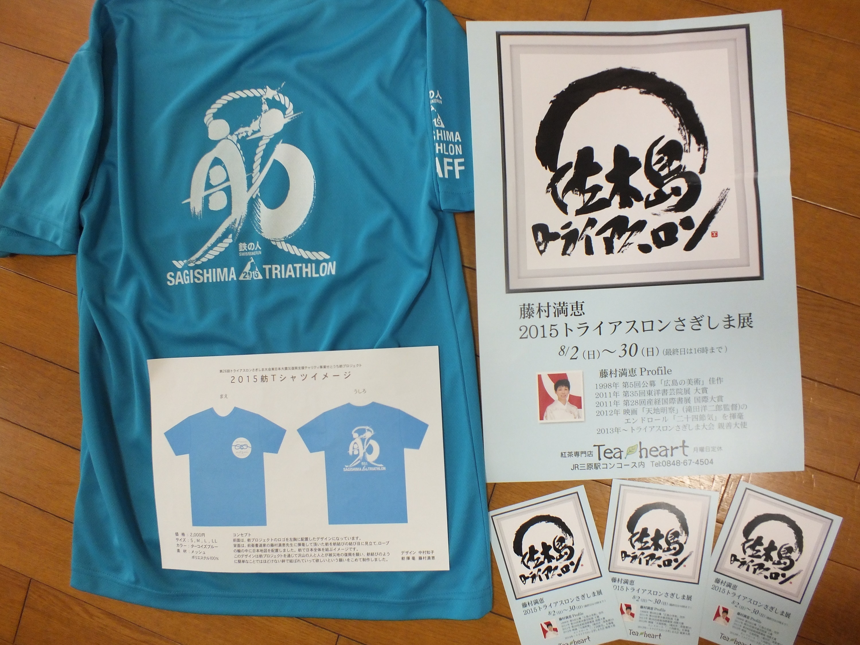 トライアスロンさぎしま大会では、2011年3月11日に発生した東北地方太平洋沖地震による被災者の皆様に復興支援として 「せとうち舫プロジェクト」を立ち上げ、オリジナルTシャツを制作・販売し、その収益全額を「桃・柿育英基金」に寄付をしています。 今年のTシャツの色は、佐木島の海を思わせる鮮やかなブルーです。 私が揮毫した「舫」の文字に、デザイナーの中村知子さんがロープの中に日本地図を配置され、舫で日本全体を強く結ぶというイメージでデザインをされました。