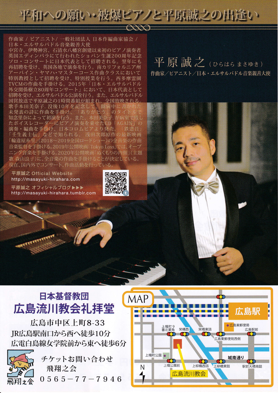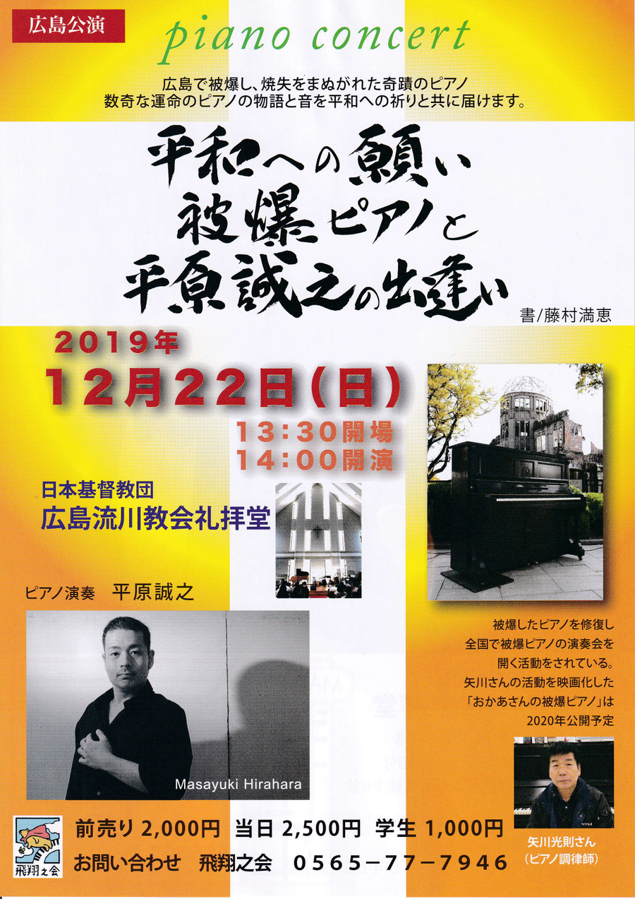 2019年12月22日(日)平原誠之被爆ピアノコンサートを広島市流川教会礼拝堂において開催致します。
