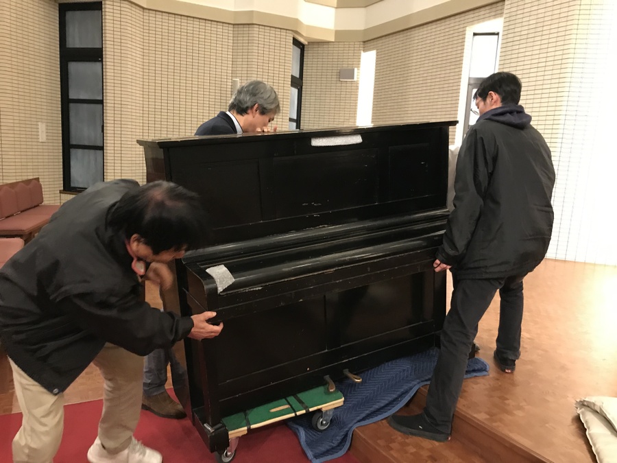 コンサート前日、被爆ピアノ所有者矢川正則さんの被爆ピアノミサコのピアノが流川教会に搬入されました