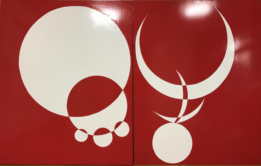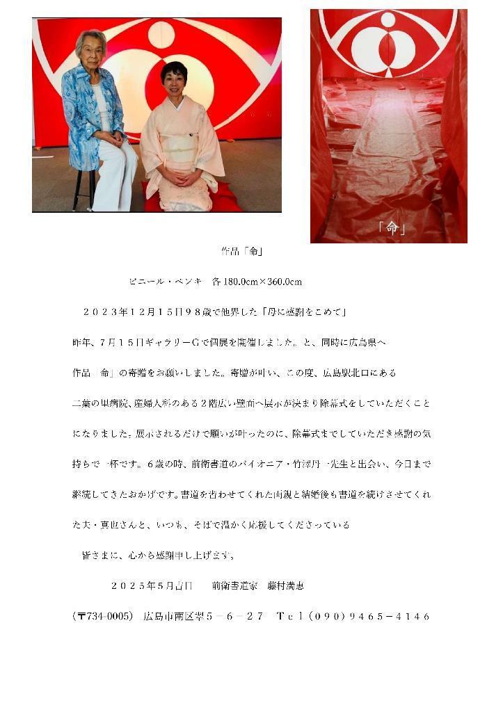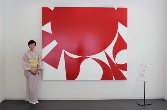 寄贈させていただきました私の作品は、1996年頃から現代美術に興味を持ち2年がかりで技術を習得。漢字をシンプルにして、ビニールにペンキで描くという独創的な作品です。最初の作品は、広島市現代美術館主催・第5回公募「広島の美術」で佳作を受賞しました。