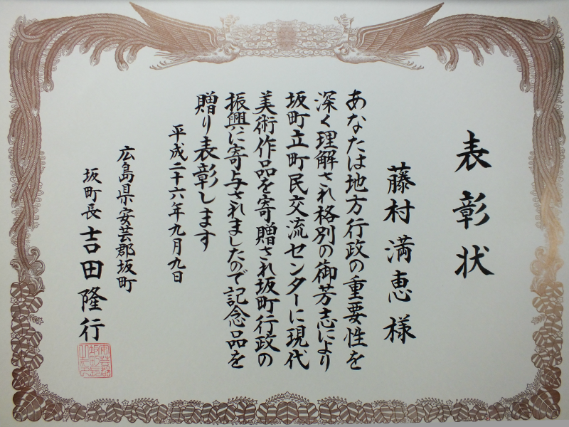 2019年10月1日三原天満市長様から三原市新庁舎へ寄贈した作品「結」の感謝状を頂きました。