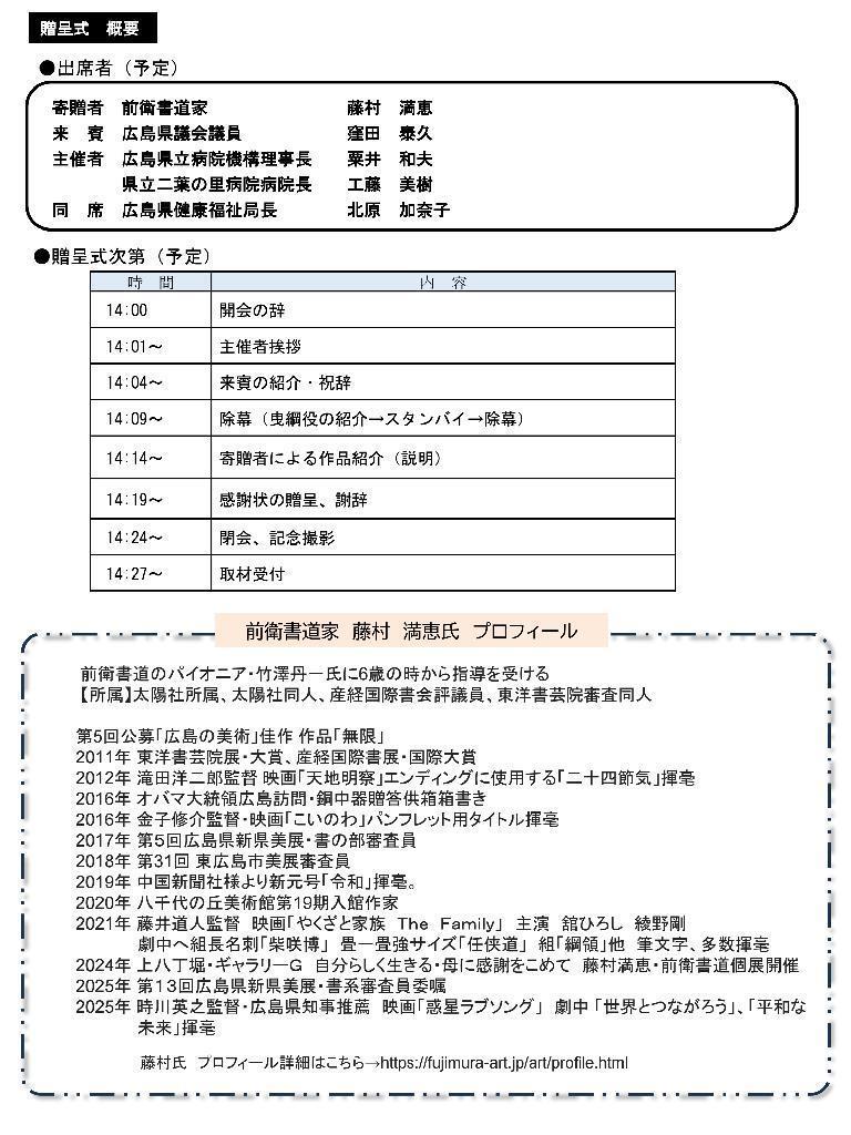 寄贈にあたりまして、海田町西田町長様、海田町教育委員会伊藤様、西国街道百本会長様にはご尽力をいただきました。心から感謝申し上げます。これからも、海田町に想いを馳せ書道の道を邁進したいと思います。