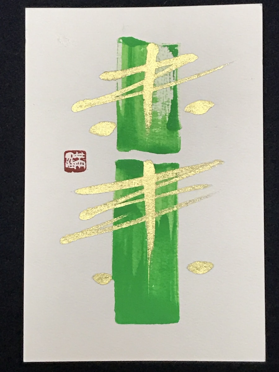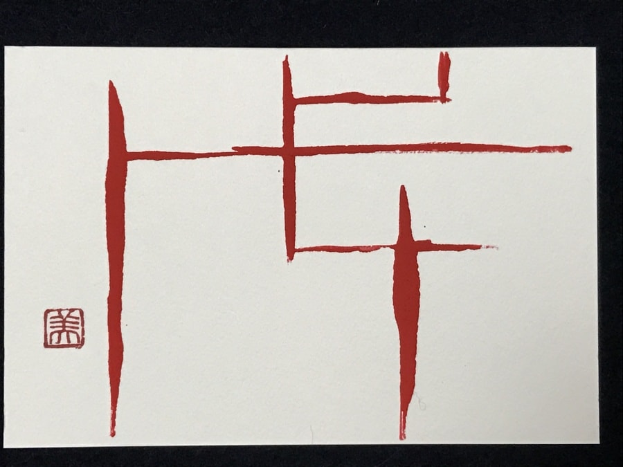 2017年11月20日、中国新聞文化センター・イオン三原教室で手書きの年賀状の講座をさせて頂きます。1日講座 心遊び、手遊び 年賀状を楽しむ 来年は、戌年です。この作品は、厚紙の側面へ赤い彩色絵の具をつけて書きました。