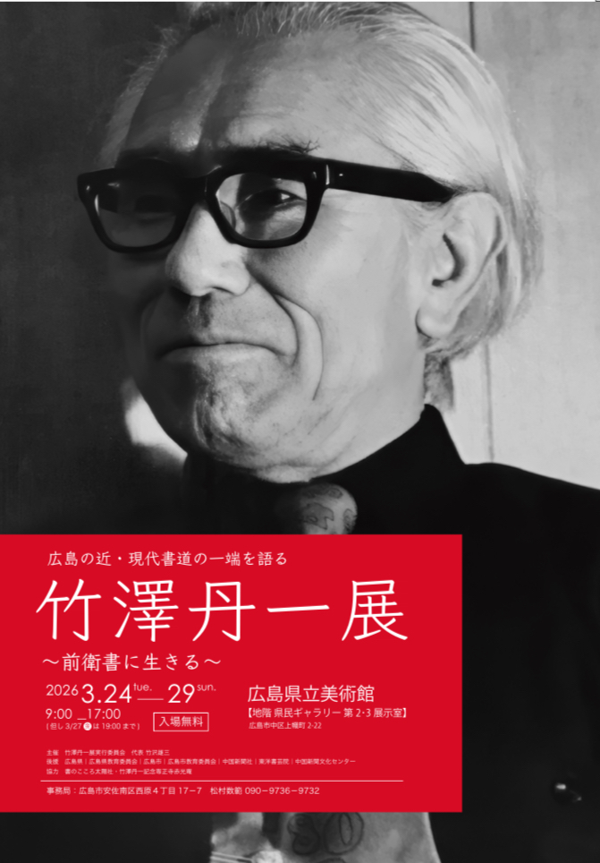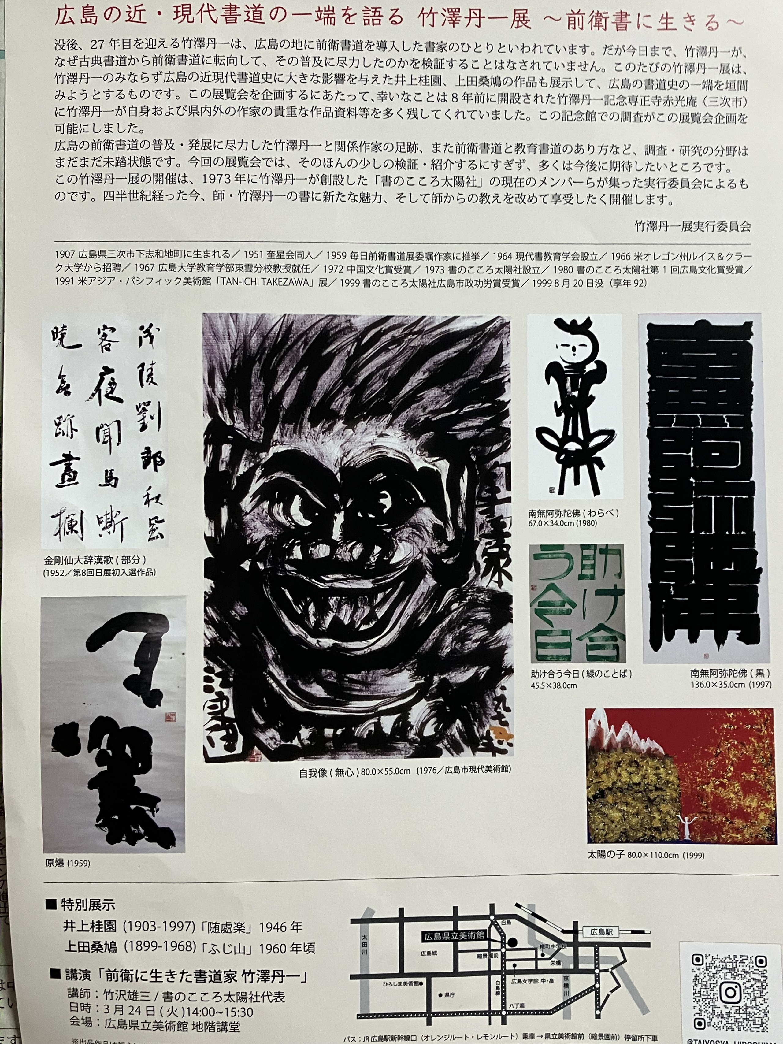 竹澤丹一展開催 展示内容(古典から前衛まで) 作品・原爆 テープカット 山本一隆様 代表竹澤雄三 森田靖様 会場風景 生徒さんたち 占部先生 香織先生 講演風景 講演風景 展示風景 展示風景 2018年6月1日、書の恩師・竹澤丹一記念館「赤光庵」を竹澤雄三氏が設立されました。三次市志和地町は、竹澤先生のご出身地です。菩提寺の専正寺様のご協力で建設されました。 2019年11月2日~12月1日まで(同、日、祝日のみ)、上田桑鳩、竹澤丹一、世木田江山展~前衛精神の継承と題して赤光庵で開催されます。 植田桑鳩先生の前衛精神を、2名の先生方が受け継がれてきたことを回顧します。 赤光庵のリーフレットです。 竹澤丹一記念専正寺赤光庵FB ,facebook,,{"facebookPageUrl":"https://www.facebook.com/%E7%AB%B9%E6%BE%A4%E4%B8%B9%E4%B8%80%E8%A8%98%E5%BF%B5%E5%B0%82%E6%AD%A3%E5%AF%BA%E8%B5%A4%E5%85%89%E5%BA%B5-1869715439741467/","boxHeight":"500","boxWidth":"100","dispFace":true,"dispUpdate":true,"dispHeader":true,"wUnit":"%"} 2018年10月16日赤光庵で、ドイツ在住の竹澤丹一先生のお孫様竹澤絵里子さんが世界的なトランペット奏者パートナーのラインホルト・フリードリヒ氏と祝賀演奏をされました。 専正寺では、町民の方々の前で演奏されました。 2019年12月5日、ライホルト・フリードリヒ氏は広島交響楽団ディスカバリー・シリーズ指揮者下野氏のプロデュースでトランペットを演奏されます。 竹澤絵里子さんとライホルト・フリードリヒ氏による、前衛書道家・竹澤丹一記念「トランペットとピアノのゆうべ」共演のお知らせです。 2019年11月28日,三次市民きりりホールで演奏会が開催されます。